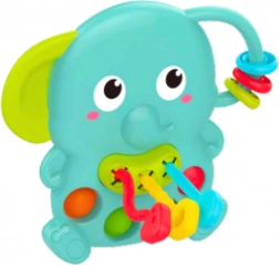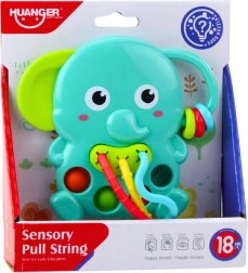 - Sensorické chrastítko slon, pohyblivé korálky a kroužky, barevné šňůrky k tahání