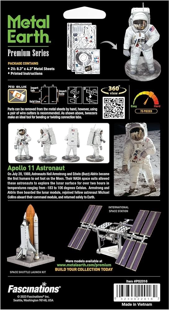 Objevte radost z precizní kovové modelařiny s prémiovou sérií METAL EARTH. Z plochých čtvercových plátků oceli sestavíte realistickou miniaturu astronauta Apollo 11 s jemným laserovým gravírováním, které podtrhuje každý detail skafandru.