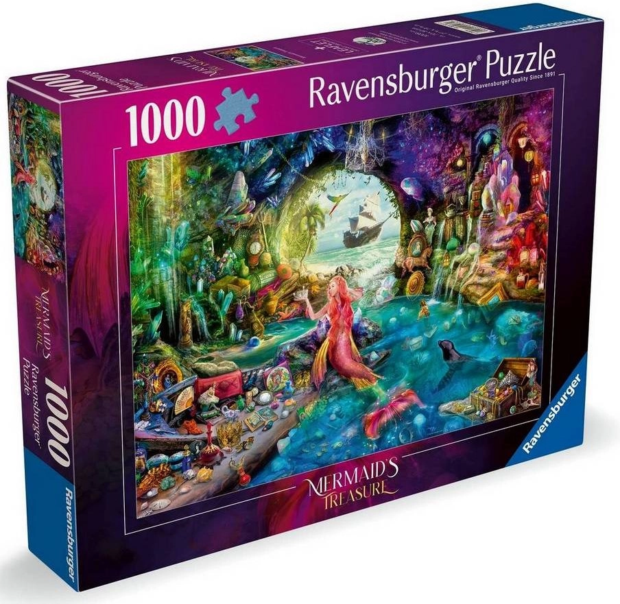 Objevte kouzlo oceánu s kvalitním puzzle RAVENSBURGER o 1000 dílcích. Ilustrace mořské panny a skrytého pokladu přináší bohaté detaily, precizní výsek a přesné zapadání pro dokonalý zážitek z skládání.