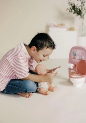 Stylová koupelnová sada pro panenky z řady Baby Nurse přináší vše potřebné pro každodenní péči. Součástí je toaleta, umyvadlo se zrcadlem, rolička toaletního papíru a doplňky jako kartáček na zuby a kelímek. Vhodné pro panenky do 42 cm a vyrobeno z minimálně 75 % recyklovaného materiálu.