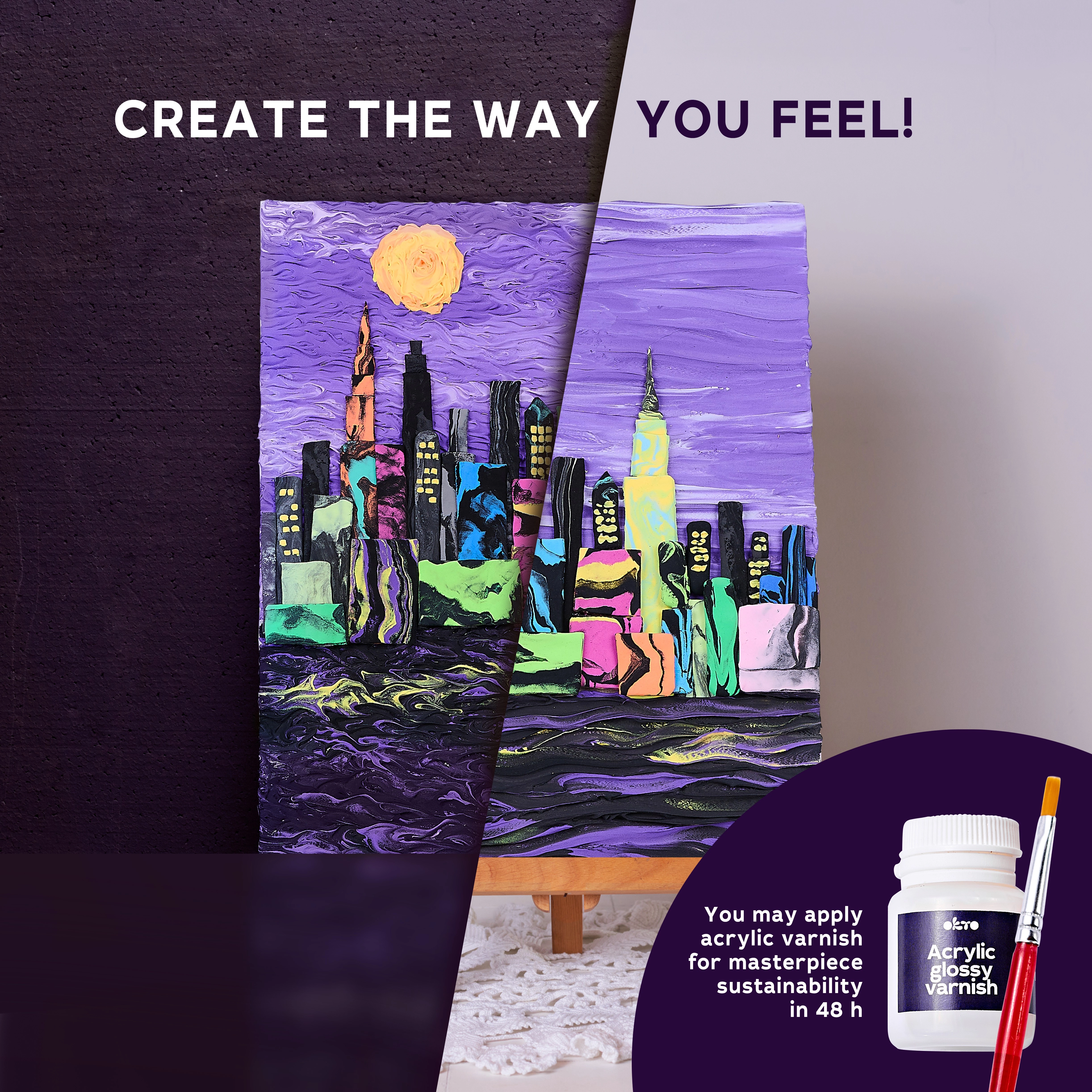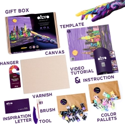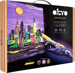 Tato výtvarná sada OKTO vás provede krok za krokem technikou malování modelovací hmotou. Vytvoříte efektní plastický obraz s ikonickým motivem Skyline města NEW YORK, který ozdobí váš interiér nebo potěší jako osobitý dárek.
