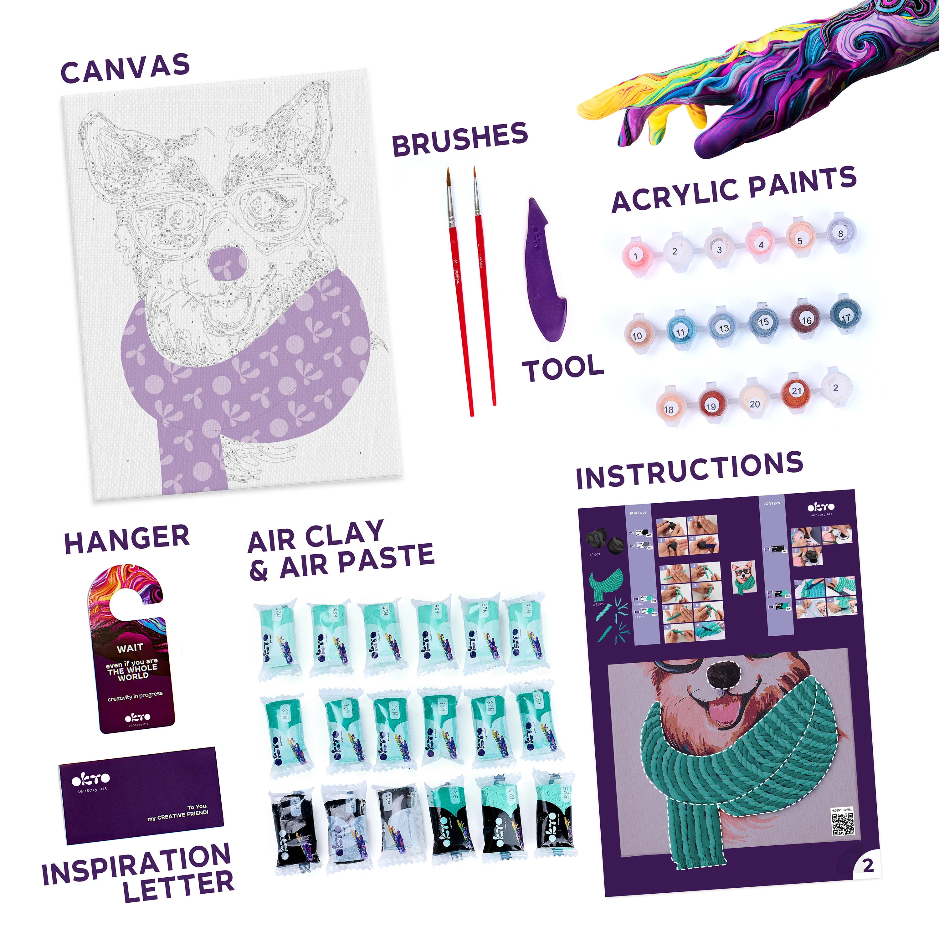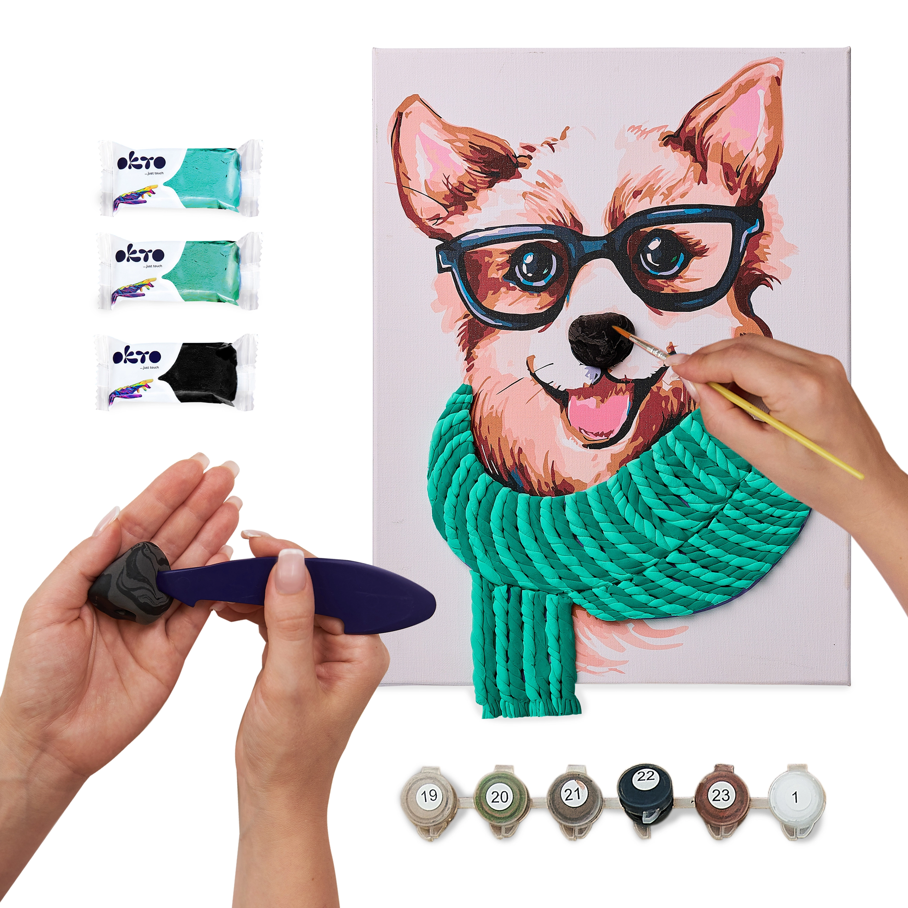 Co vytvoříte: Vybarvený obraz na plátně 30 × 40 cm s ručně tvarovaným 3D prvkem ze samoschnoucí modelovací hmoty, připravený k vystavení.