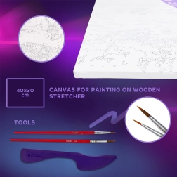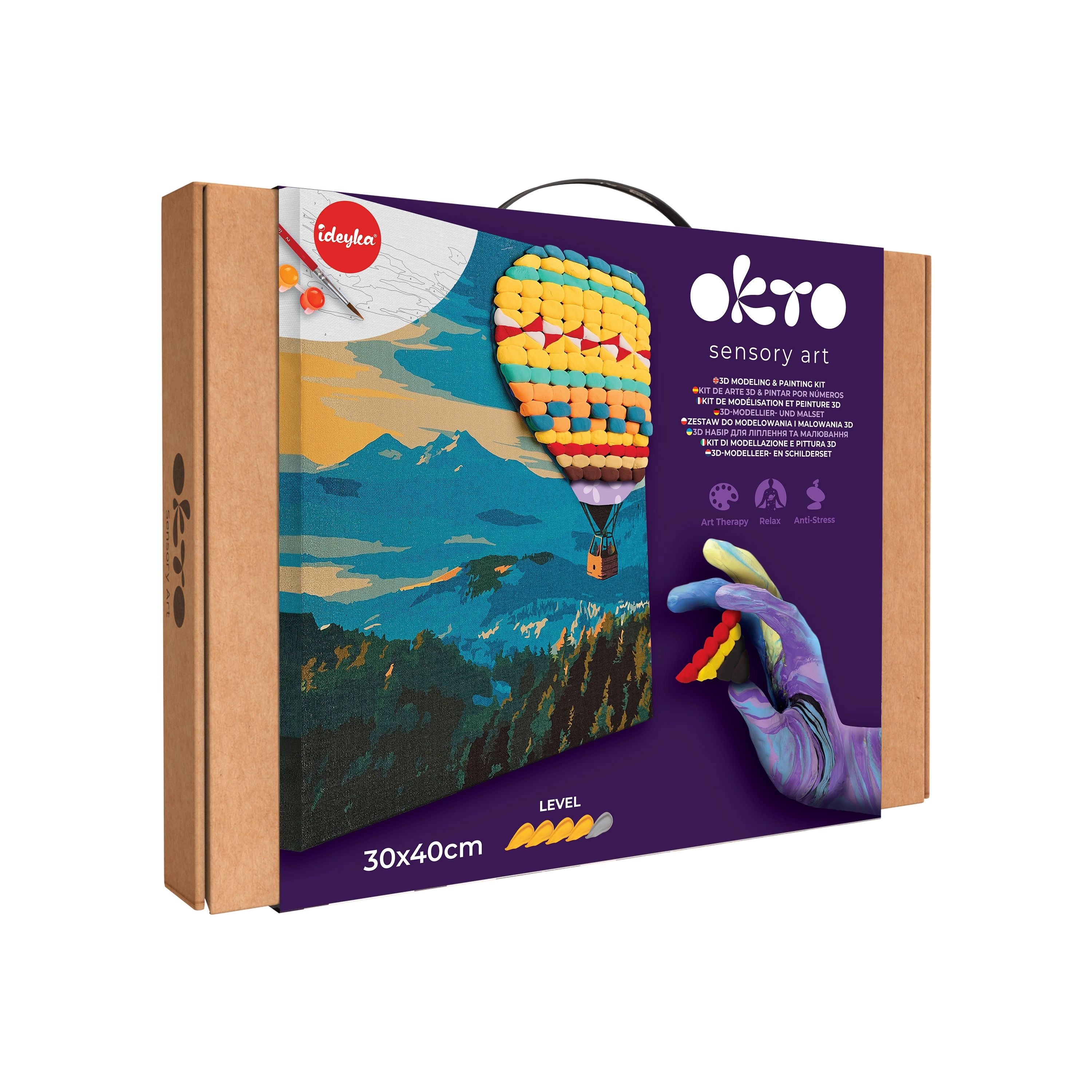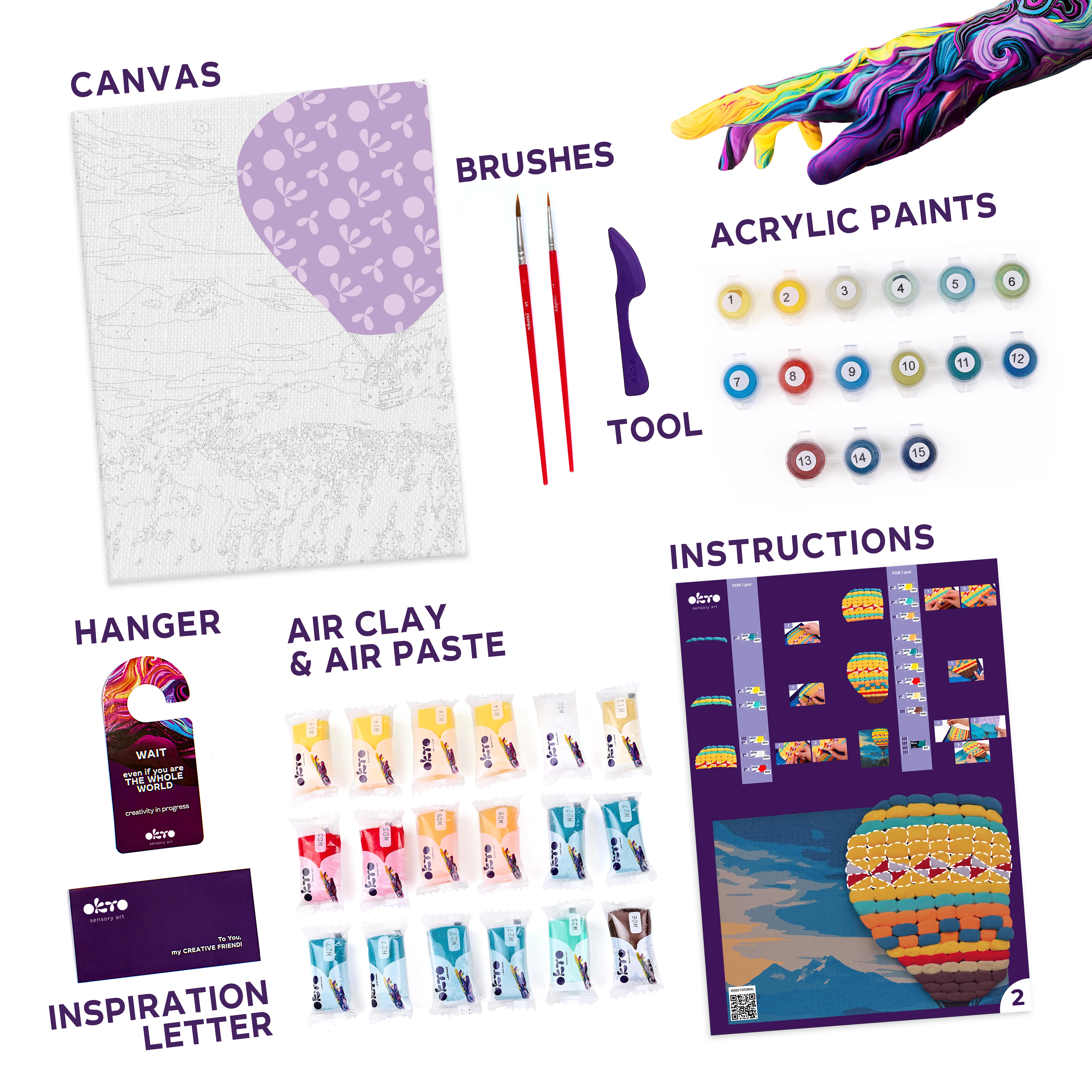 Vše potřebné najdete v balení: kvalitní plátno s předtištěnou předlohou, samoschnoucí modelovací hmota pro plastické části balónu, barvy a štětec, praktický modelovací nástroj a obrázkový návod krok za krokem. Díky jasně označeným číslům je postup intuitivní i pro mírně pokročilé tvůrce.