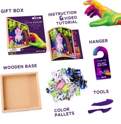 - Dřevěný rám, obrázkový návod, dřevěný modelovací nástroj, sada samoschnoucí modelovací hmoty, akrylový lak 20 ml, štětec