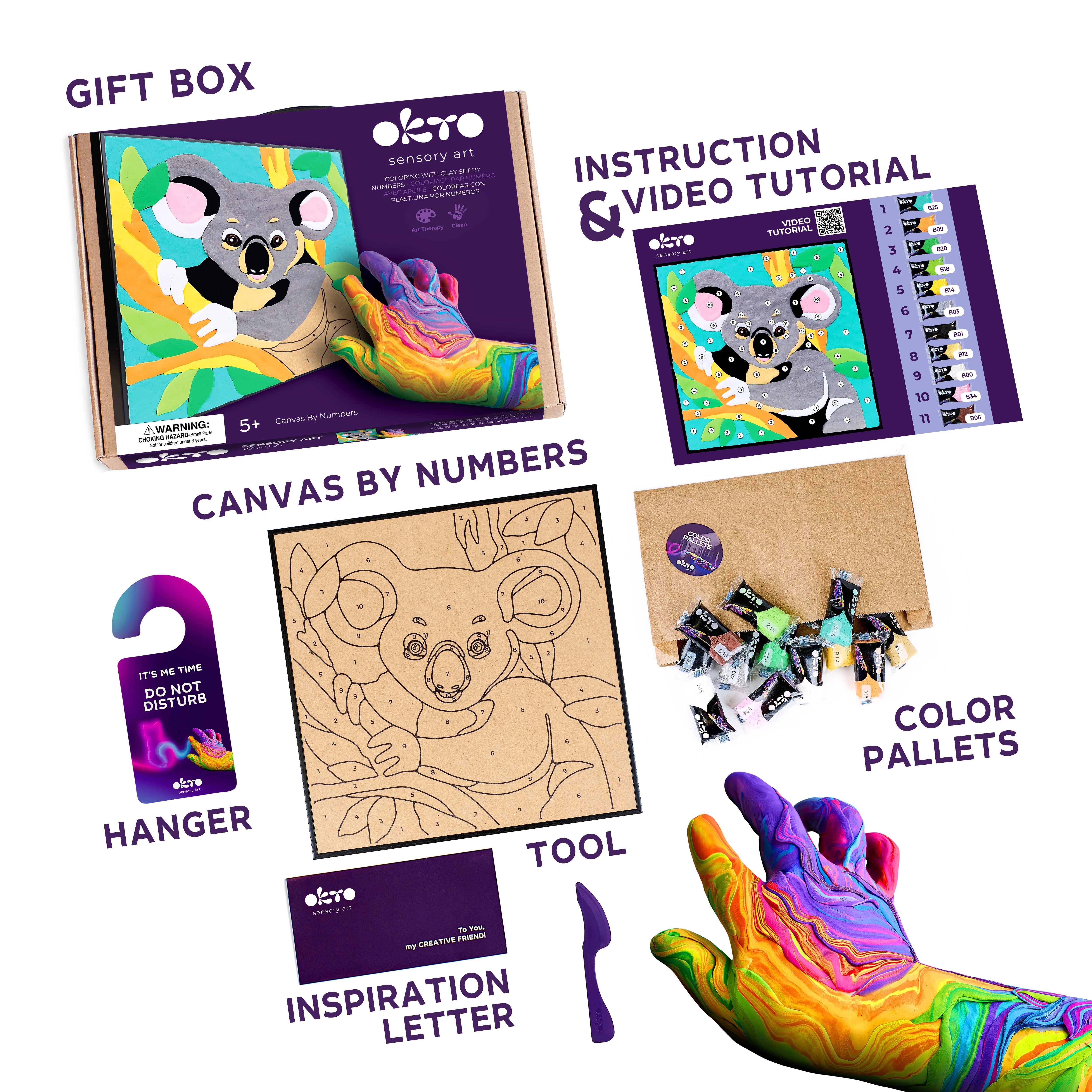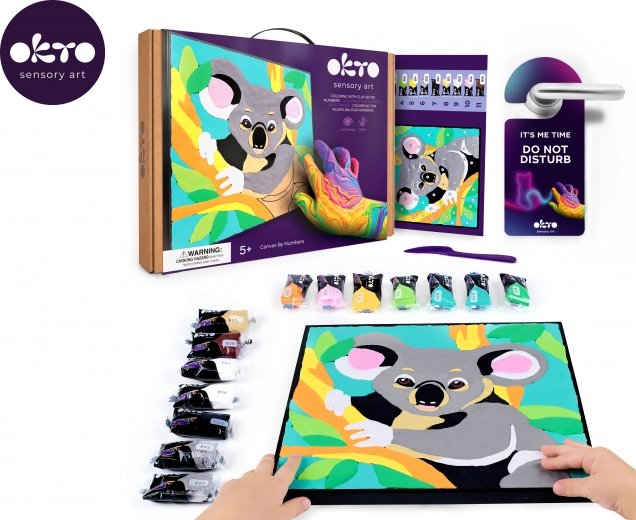 Vytvořte si jedinečný 3D obrázek s motivem koaly. Sada OKTO je navržena tak, aby byla práce intuitivní a zábavná – stačí sledovat čísla a nanášet barevnou hmotu pomocí přiloženého modelovacího nástroje. Výsledek je plastický a dekorativní, vhodný k vystavení v dětském pokoji či jako milý dárek.