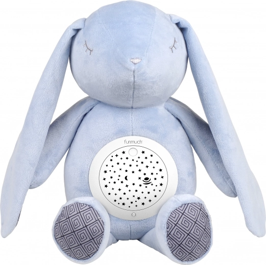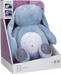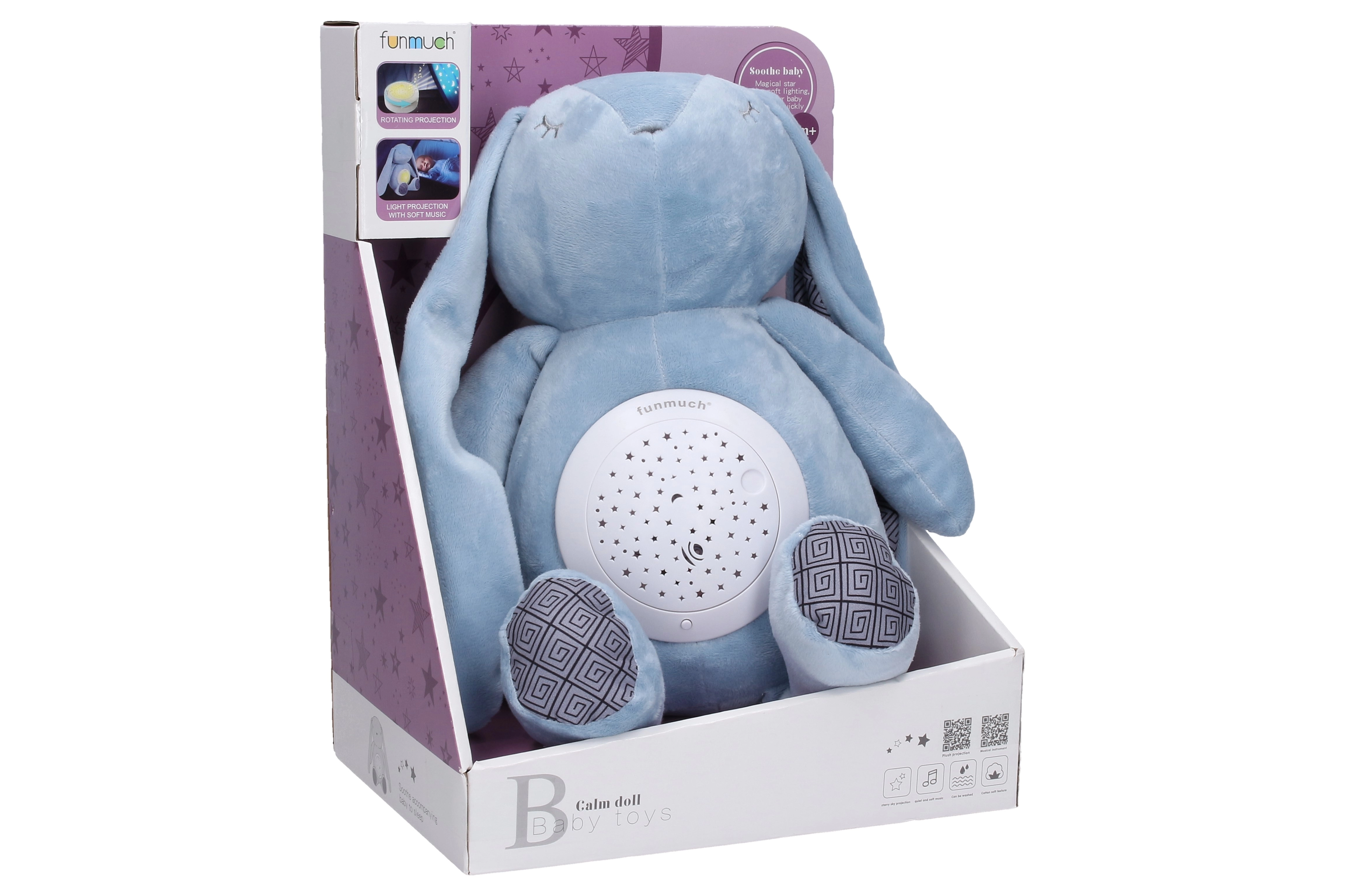 Roztomilý usínací zajíček s projekcí pomůže dětem klidně usnout. Na bříšku má svítící a otáčející se projektor, který promítá jemné světelné vzory a přehrává ukolébavky. Projektor lze snadno vyjmout, ovládá se jediným tlačítkem a funguje na 3× AAA baterie (nejsou součástí).