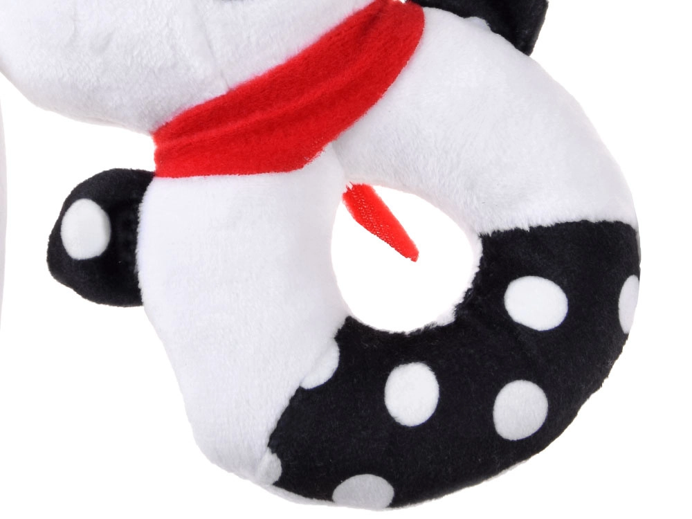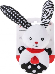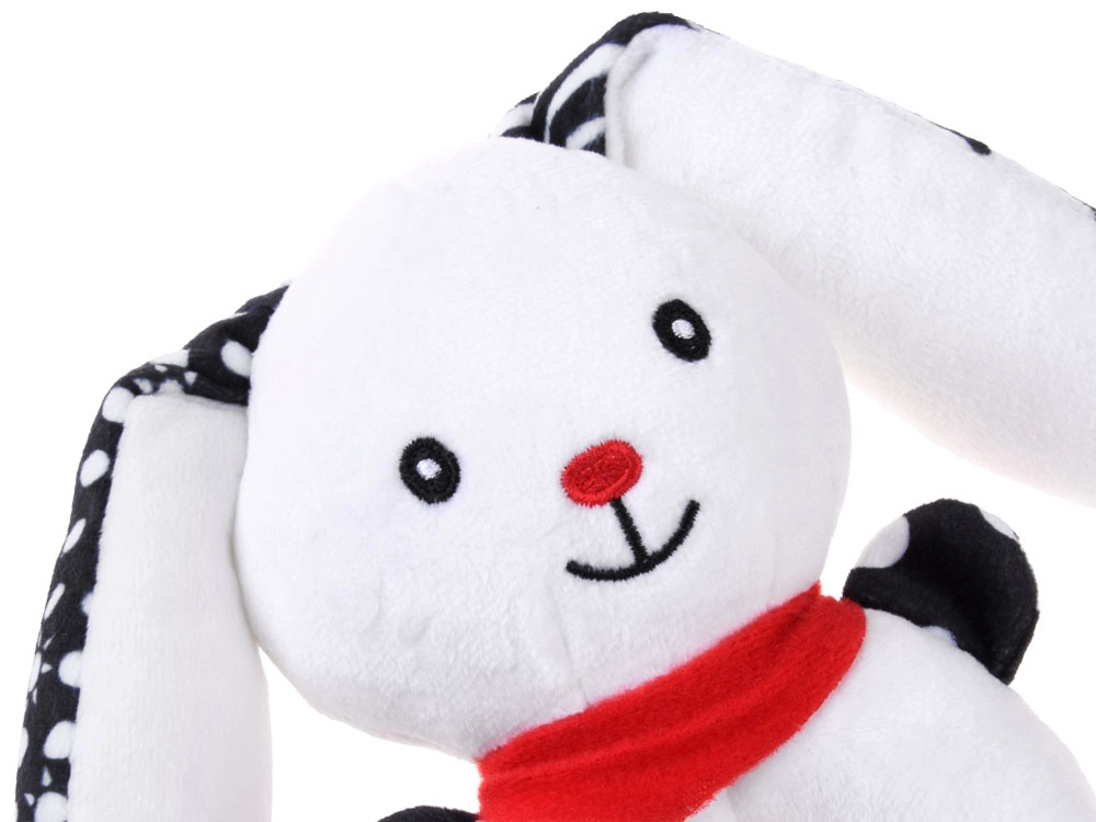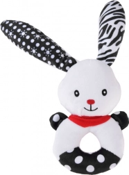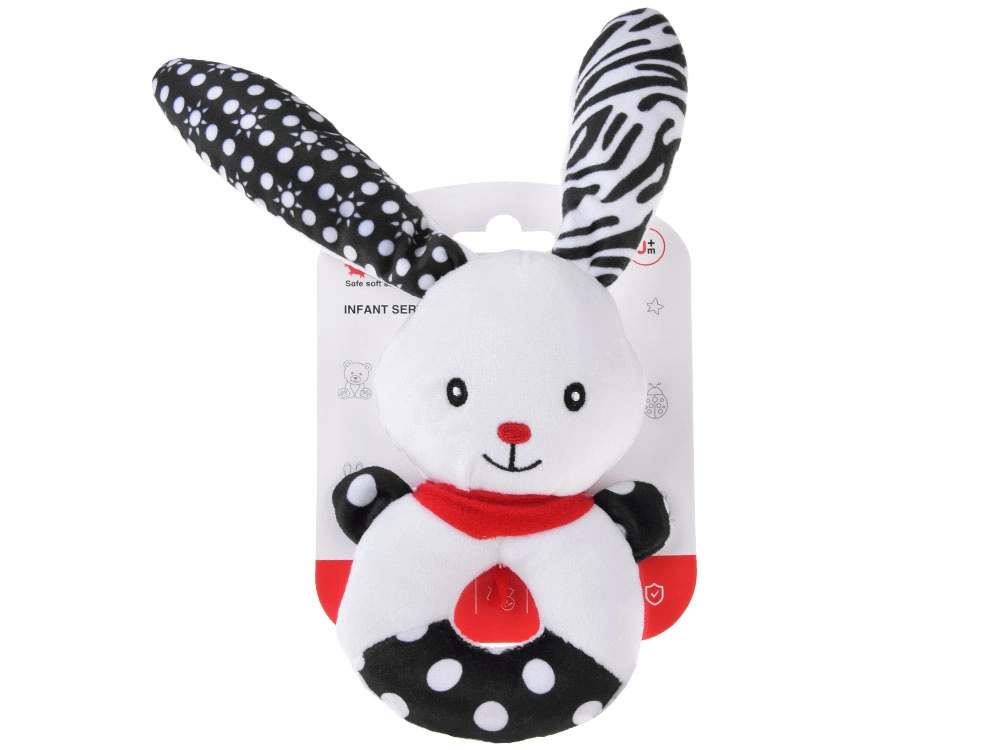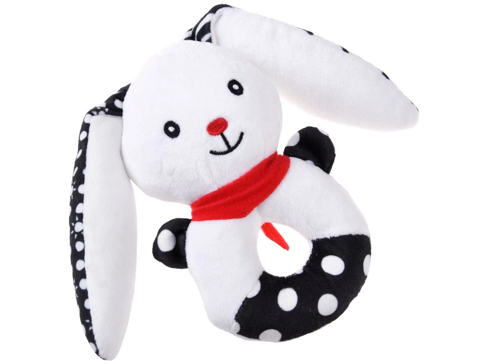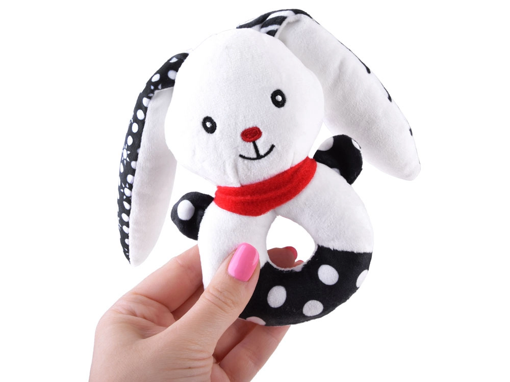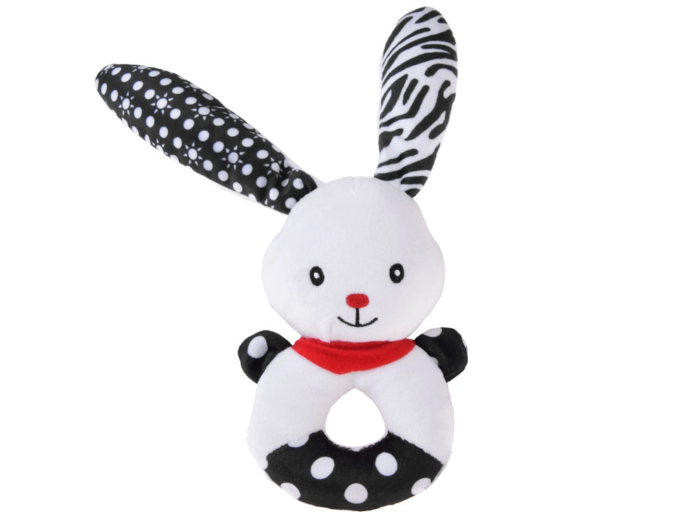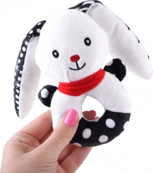 Tato měkká kontrastní hračka kombinuje funkci chrastítka, pískátka i první mazlíčkové hračky. Kulatý, snadno uchopitelný tvar s otvorem uprostřed, vystouplou hlavičkou a dlouhými oušky pomáhá trénovat jemnou motoriku a koordinaci ruka–oko. Kontrastní černobílé motivy jsou pro miminka skvěle viditelné a přitahují jejich pozornost.