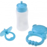 Součástí je láhev, šidítko a medvídkové chrastítko. Doplňky jsou lehké, snadno uchopitelné a skvěle ladí s oblečkem.