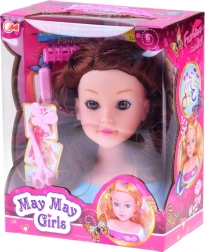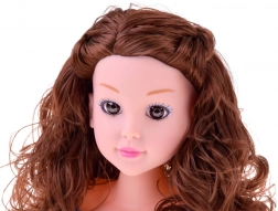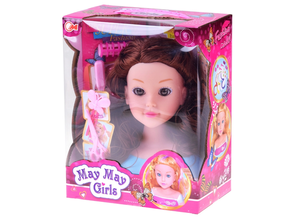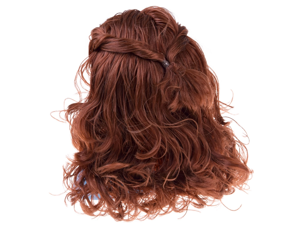 Tato stylingová hlava s dlouhými hnědými vlnitými vlasy a detailním líčením je ideální pro malé stylisty. Vlasové prameny jsou měkké a poddajné, takže se snadno češou, natáčejí i sponkují. Stabilní plastová základna udrží hlavu na místě během úprav.