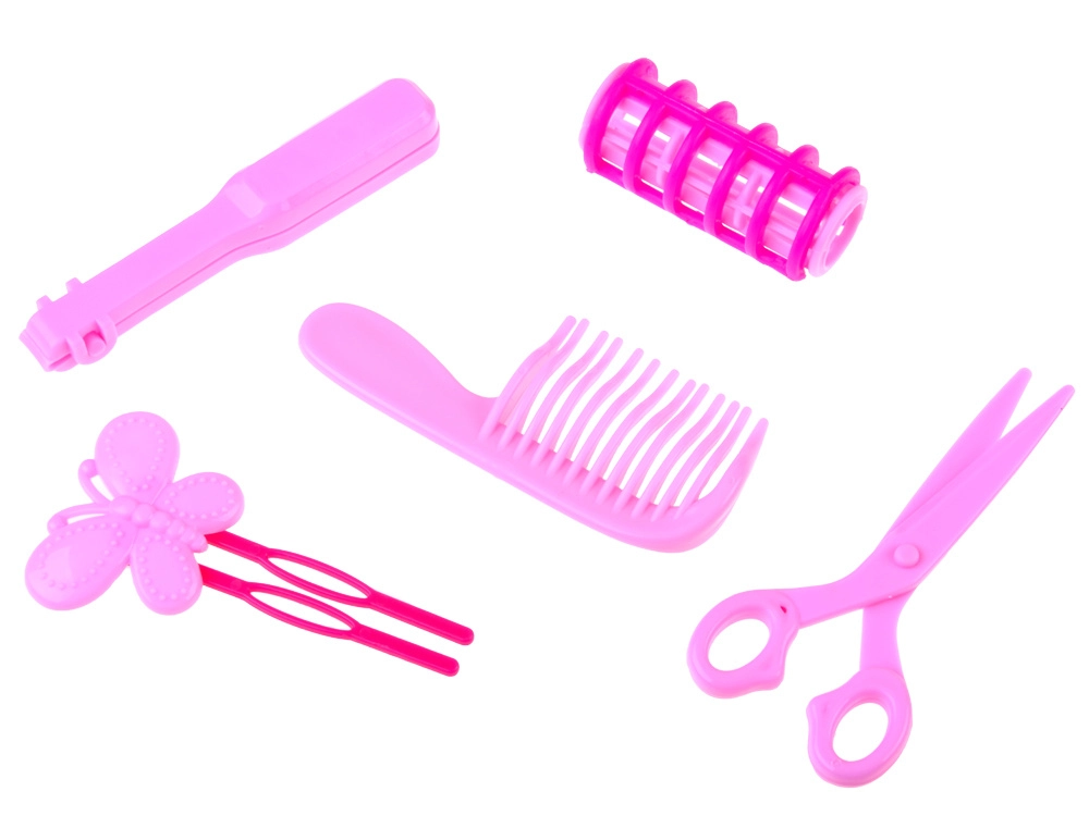 - Hlava na česání, hřeben, nůžky na hraní, natáčka, dětská žehlička/rovnačka, motýlková sponka
