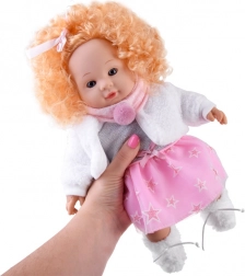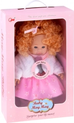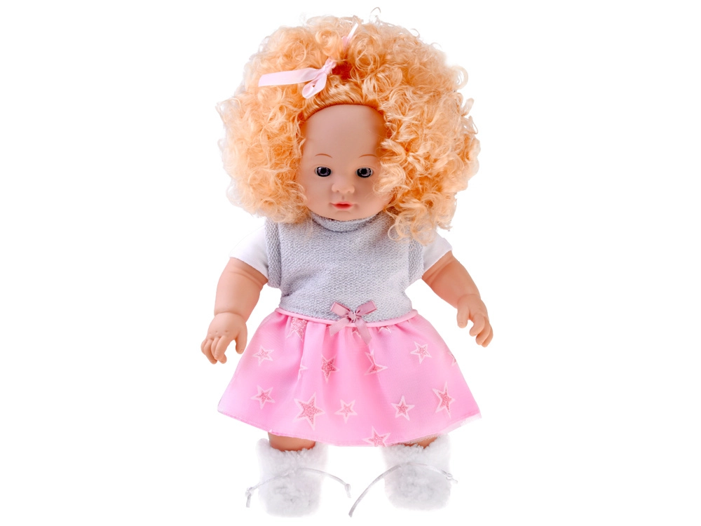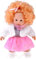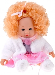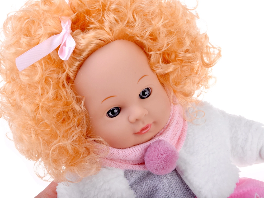 Součástí je zimní outfit: růžovo‑šedé šatičky s hvězdičkami, heboučký bílý kabátek, růžová šála s bambulkou a měkké bačkůrky. Integrovaný zvukový modul přehrává více dětských projevů, díky nimž je hraní ještě interaktivnější a realističtější.