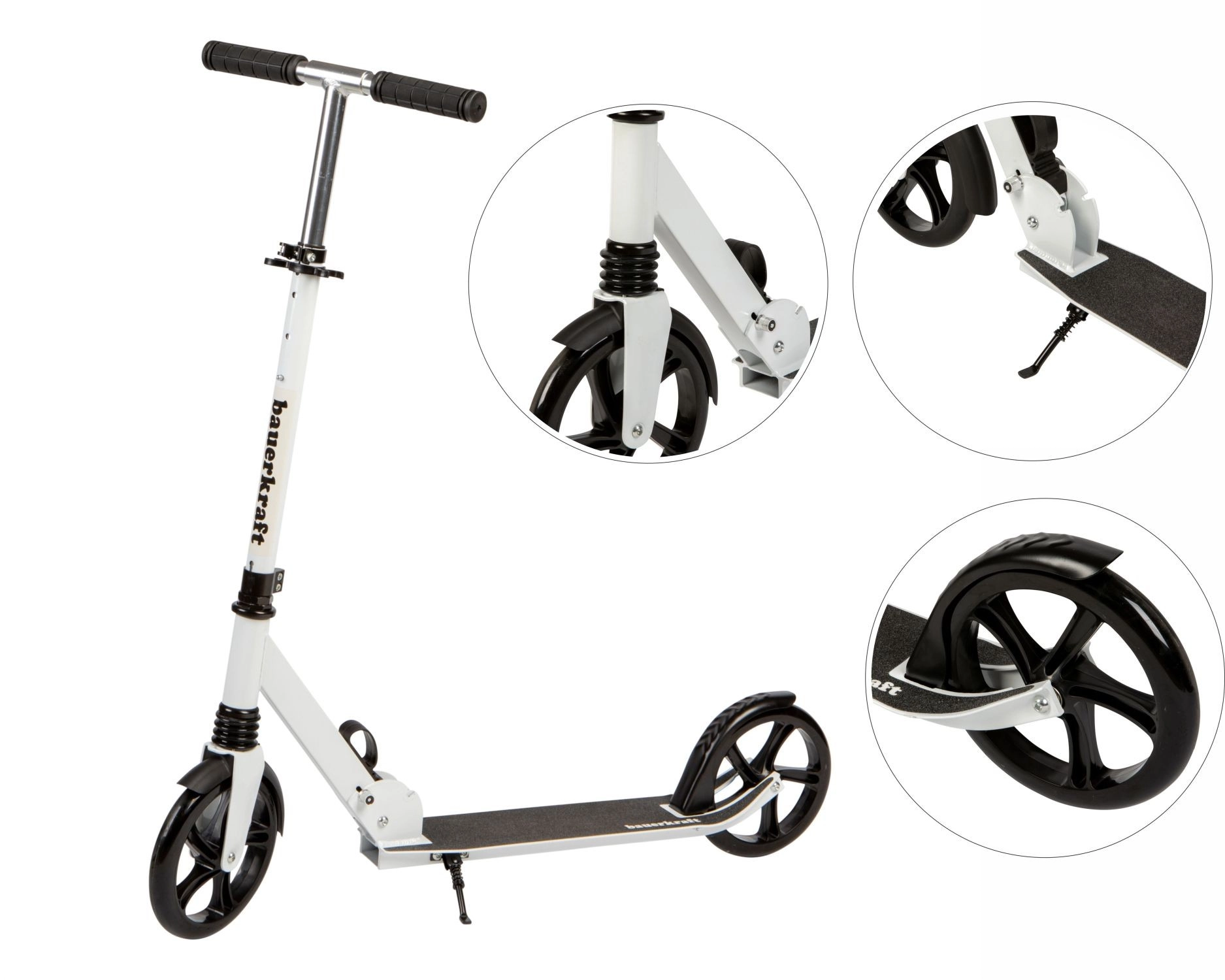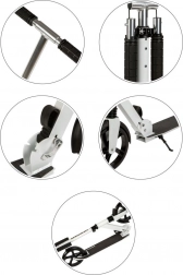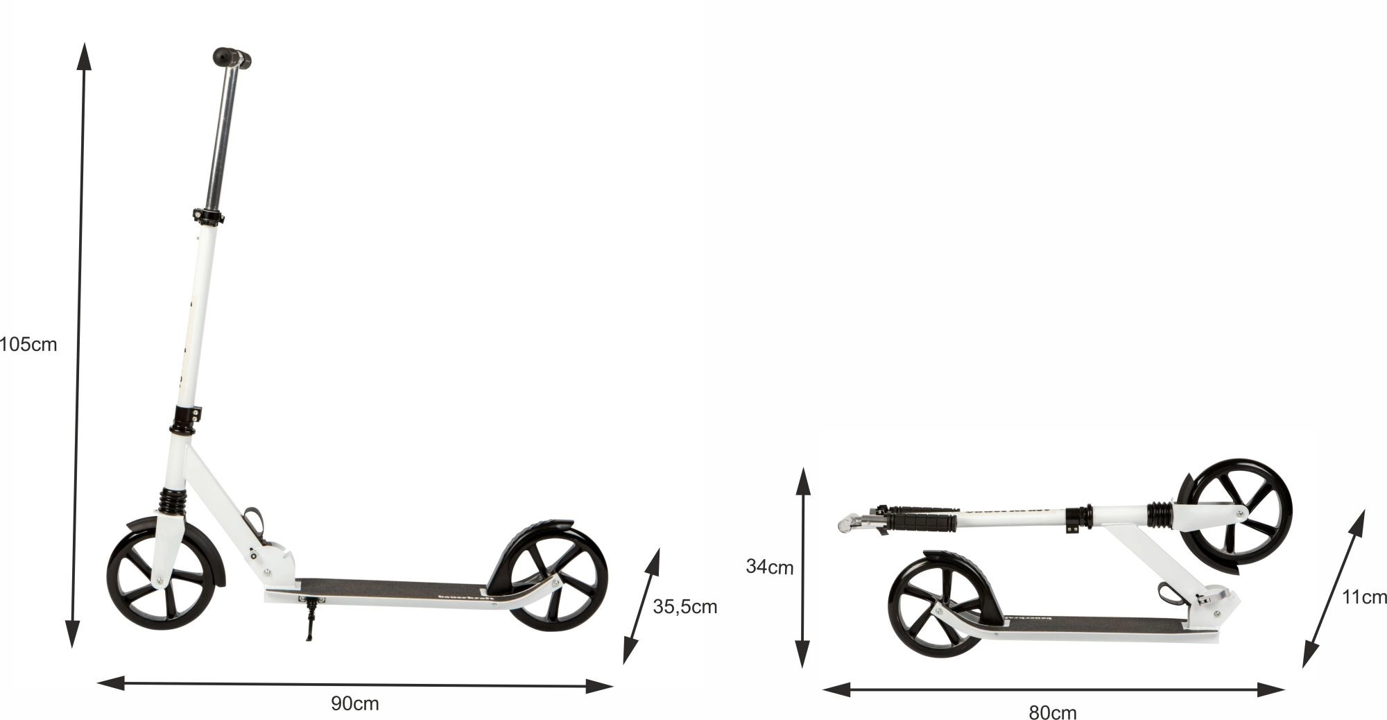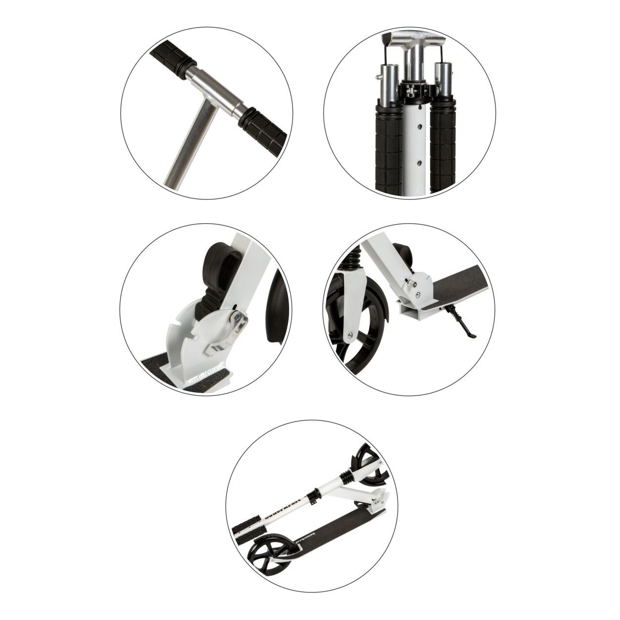 Lehká a odolná městská koloběžka pro děti a teenagery nabízí nastavitelná řídítka 95–105 cm, velká kola 200 mm s ložisky ABEC-7, přední odpružení a skládací konstrukci z hliníku. Pro bezpečnou jízdu nechybí zadní nášlapná brzda, protiskluzová deska a ergonomické gripy. Maximální nosnost 80 kg.