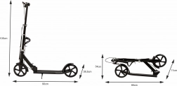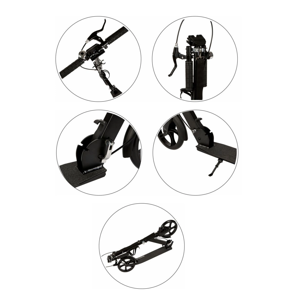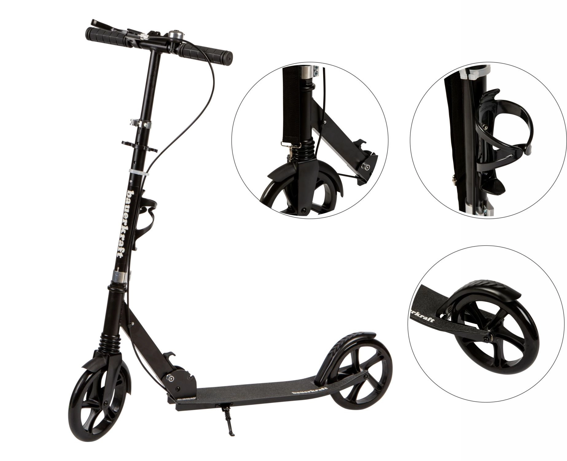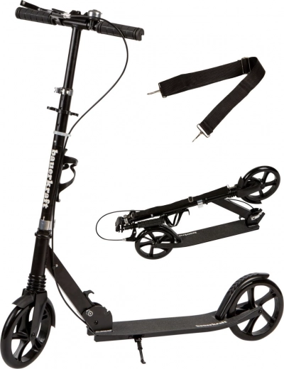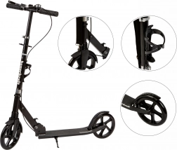 Lehká městská koloběžka z hliníku pro děti a teenagery nabízí velká 200 mm kola s ložisky ABEC-7, nastavitelná řídítka 95–105 cm, přední odpružení a skládací rám. Pro bezpečnou jízdu nechybí ruční i nášlapná brzda, protiskluzová deska, stojánek, zvonek a praktický držák na láhev. Maximální nosnost 80 kg.