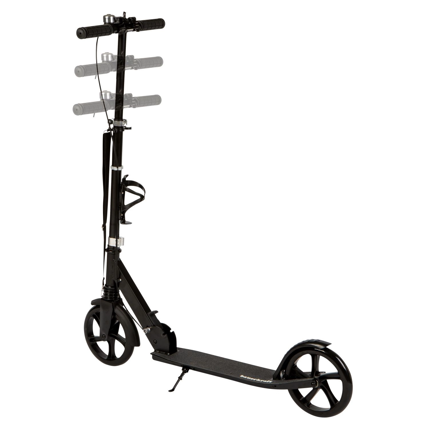 Výškově nastavitelná řídítka 95–105 cm rostou s jezdcem a pomáhají udržet ergonomickou a bezpečnou jízdní pozici. Protiskluzová deska, stojánek, zvonek a zadní blatník přidávají pohodlí i bezpečí při každodenním používání. Držák na láhev se hodí na delší trasy, aby byl nápoj vždy po ruce.