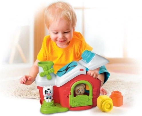 Děti si užijí i mechanické prvky: komín má funkci „stlač a vyjeď“, kdy se kostka sklouzne ven bočním otvorem, a větrník se roztočí už při lehkém dotyku. Smyslové textury na povrchu podporují rozvoj hmatu, zatímco třídění a manipulace s kostkami rozvíjí koordinaci oko–ruka a jemnou motoriku. Tematické prostředí farmy s postavičkami povzbuzuje kreativní hru a vyprávění vlastních příběhů.