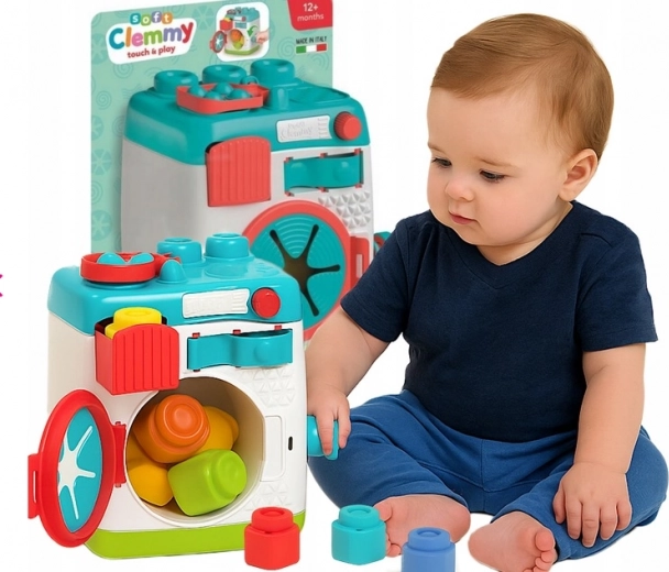 Sensorická pračka Clemmy od CLEMENTONI: mechanická zábava bez baterií, 5 měkkých kostek, rozvoj motoriky a hry na role pro děti od 12 měsíců.