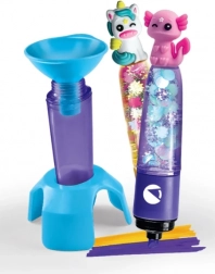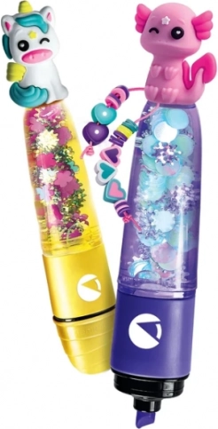 Součástí je několik barevných inkoustů, prázdné těla zvýrazňovačů, drobné ozdoby a pomůcky k sestavení. Děti si vyberou barvu, naplní fix, ozdobí jej figurkami kouzelných zvířat a mají hotový originální školní doplněk.