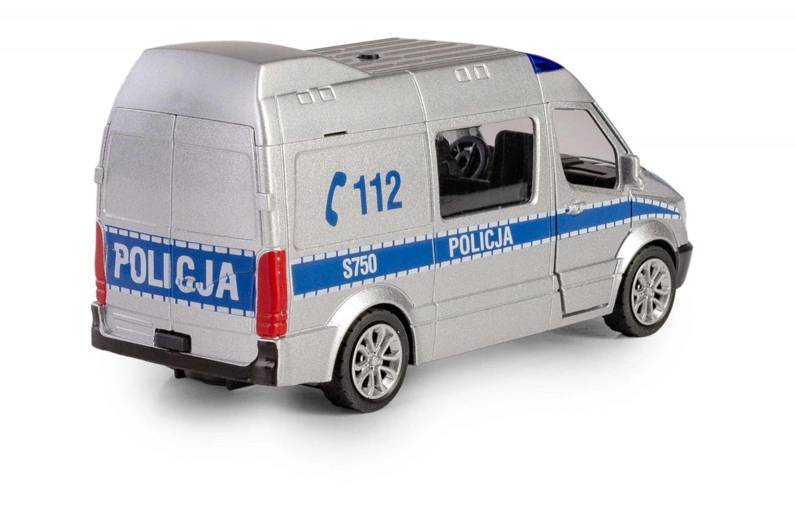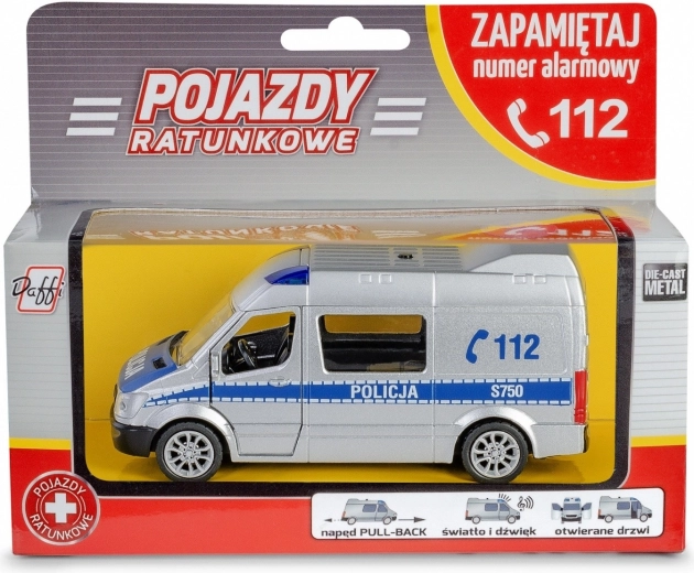 Kovový model policejního záchranného vozu typu van potěší malé i velké fanoušky techniky. Nabízí pohon na zpětné natažení, otevírací dveře a realistické světelné a zvukové efekty. Ideální do sbírky i na každodenní hraní.