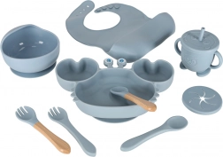 Tato 9dílná silikonová sada pokryje všechny potřeby u stolování: talíř s přepážkami ve tvaru kraba pro lepší organizaci jídel, miska a talíř s přísavkou proti klouzání, hrneček se dvěma víčky a brčkem, bezpečné příbory pro malé ruce a voděodolný bryndák s kapsou na zachycení drobků.