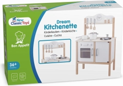Stylová dětská kuchyňka ze dřeva v bílé barvě nabízí dětem od 3 let hodiny kreativní hry. Má dvouplotýnkový vařič, troubu s průhlednými dvířky, odnímatelný dřez, odkládací police a hodiny s pohyblivými ručičkami. Součástí je hrnec s poklicí, pánev, 3 kusy dřevěného náčiní a slánka s pepřenkou – vše pro realistickou kuchařskou zábavu a rozvoj sociálních dovedností.