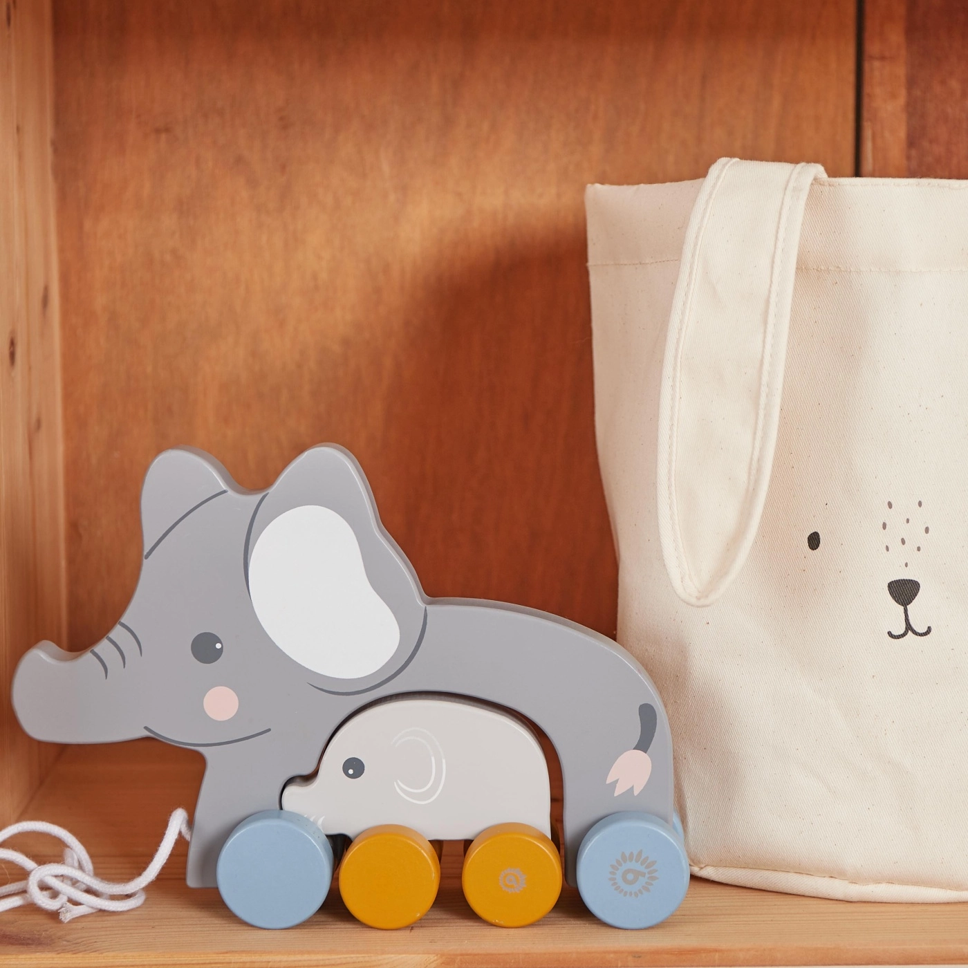 Roztomilá tahací hračka se sloní rodinkou z kvalitního dřeva podpoří první krůčky i jemnou motoriku. Větší slon s vyjímatelným mládětem, měkká bavlněná šňůrka a hladké, bezpečné zpracování dělají z této hračky ideálního parťáka pro malé objevitele od 12 měsíců.