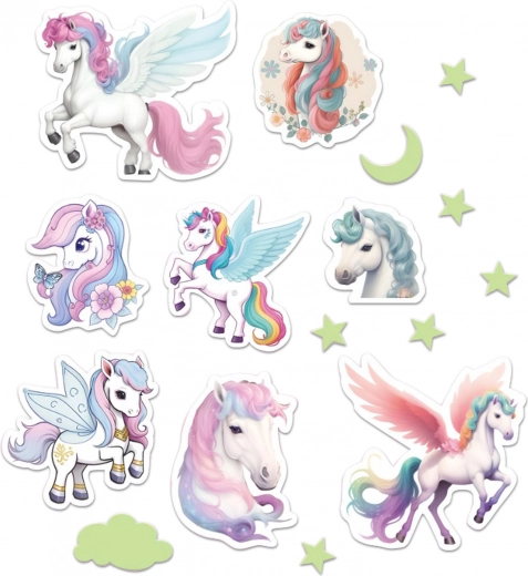 Vytvořte magickou atmosféru pomocí samolepicí dekorace s jednorožci. Ve dne potěší veselými barvami a v noci jemně fosforeskuje, takže děti se budou cítit klidněji a bezpečněji.