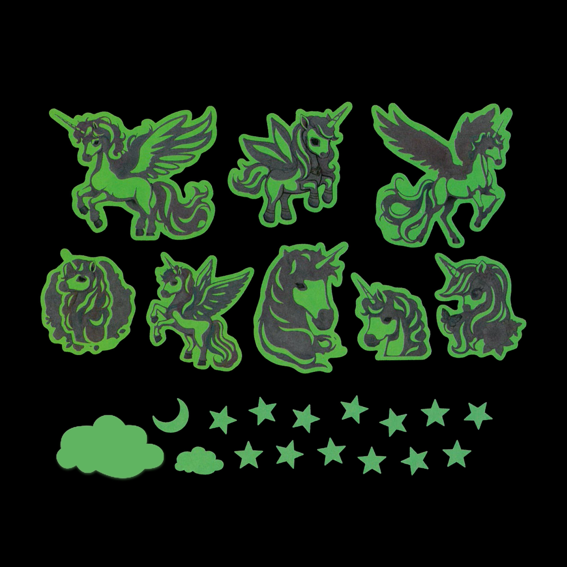 Rozveselte dětský pokojík kouzelnou dekorací s motivem jednorožců, která se snadno nalepí na stěnu či nábytek a po zhasnutí svítí ve tmě. Stačí nalepit a usínání bude hračka!