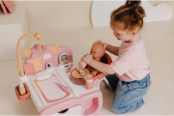 Kuchyňka s vysokou židličkou, pečující stanice a útulná postýlka s kolotočem poskytují kompletní zázemí pro každodenní péči o panenku.
