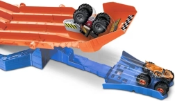 Zažijte adrenalinový závod s Hot Wheels Monster Trucks – set Demoliční závod nabízí čtyři jízdní pruhy, startovní bránu pro současný start a náhodnou výhybku, která rozhodne, kdo projede do cíle a kdo skončí v parádní havárii. Součástí jsou 2 trucky v měřítku 1:64 (Mega‑Wrex a Tiger Shark) a možnost rozšíření o další auta a dráhy.