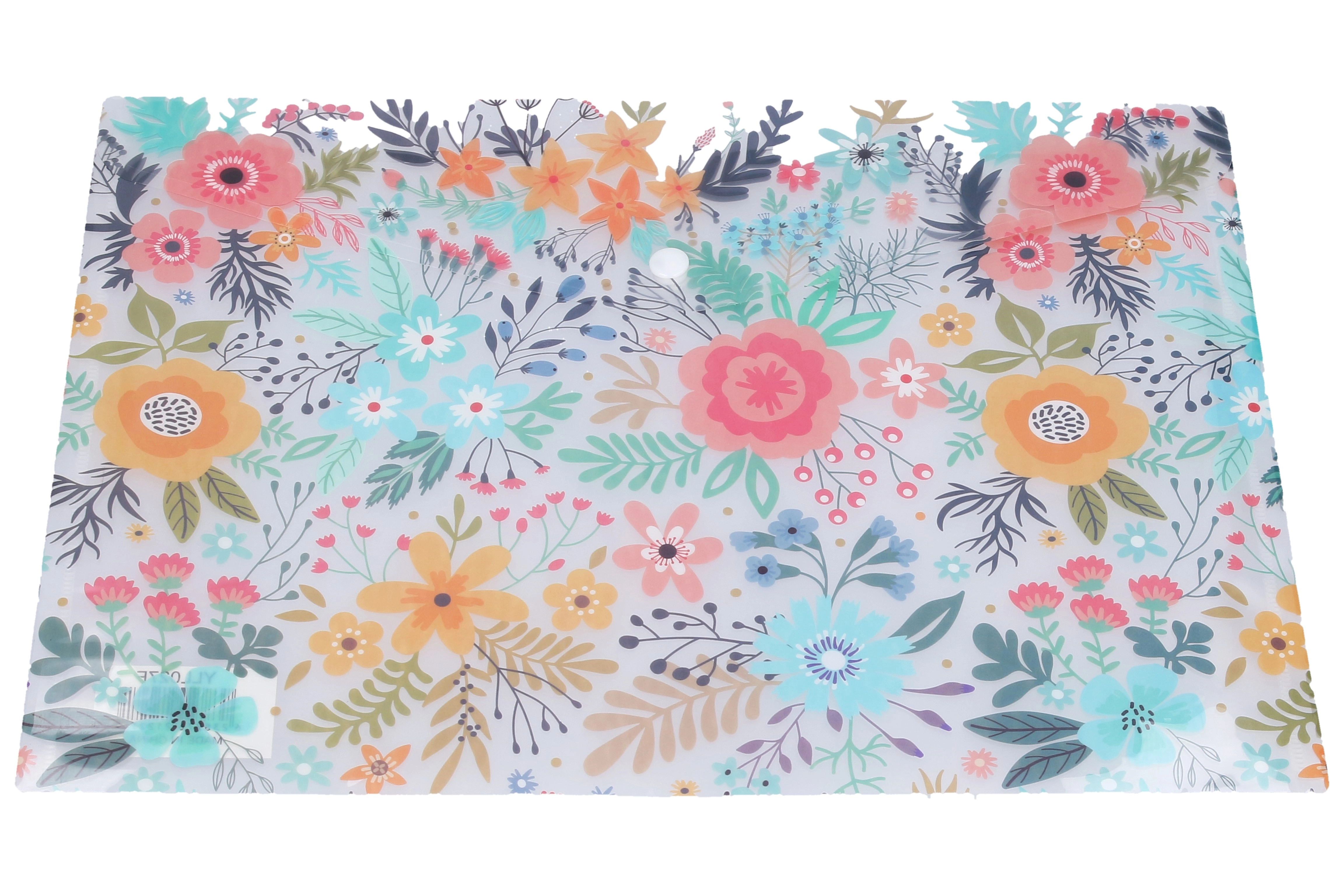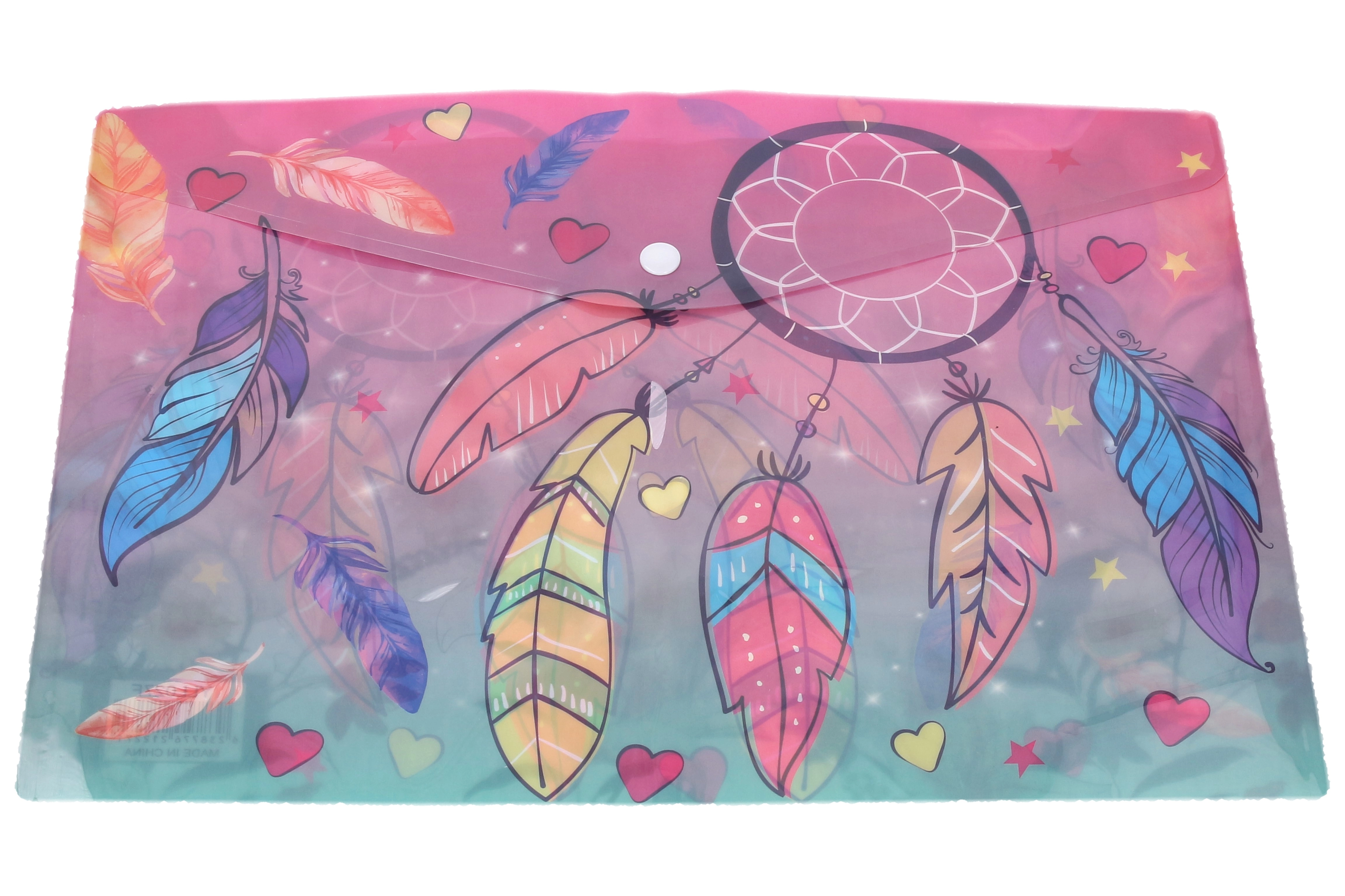 Složky jsou dodávány v atraktivním mixu motivů – květiny, motýlci či lapač snů – a hodí se pro školáky, studenty i do kanceláře. Snadno se otvírají i zavírají pomocí pevného patentního druku, takže vše zůstane na svém místě i při přenášení.