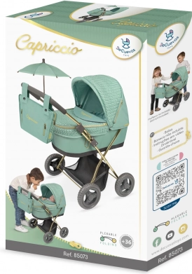 Stylový kočárek pro panenky z kolekce Capriccio 2025 potěší moderním designem v mentolově zelené, nízkou hmotností a snadnou manipulací. Nabízí skládací konstrukci, slunečník, odnímatelnou tašku se zlatými zipy, měkkou matraci a praktický úložný koš – ideální pro menší děti od 3 let.