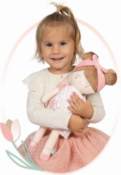 Roztomilá plyšová panenka Tulipe o velikosti 36 cm je ideální první kamarádka pro nejmenší. Je vyrobena z jemného hladkého plyše, je lehoučká a díky ručnímu praní na 30 °C se snadno udržuje. Pastelové lososové tóny a květinové detaily z kolekce Tulipe přinášejí krásný španělský design a hebké mazlení doma i na cestách.
