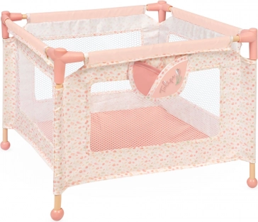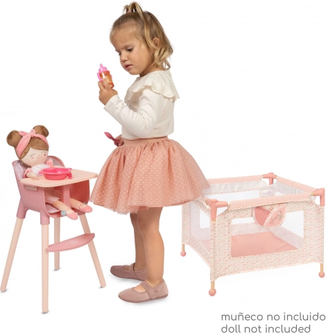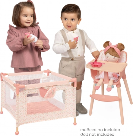 Set zahrnuje pevnou hrací ohrádku se síťovanými bočnicemi a praktickou kapsou na drobnosti a také jídelní židličku s odnímatelným pultíkem a tříbodovým pásem pro bezpečné usazení panenky. Oba produkty jsou navrženy pro panenky do 36 cm a vynikají snadnou manipulací i údržbou.