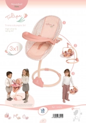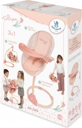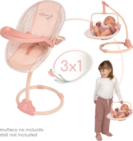 Stylová dětská židlička a houpačka 3 v 1 z kolekce Tulipe potěší jemným designem i chytrou funkčností. Díky odnímatelnému oboustrannému sedátku ji lze využít jako jídelní židličku, houpačku i nosítko. Nechybí bezpečnostní popruhy, plastový pultík na krmení a lehká, ale stabilní konstrukce pro snadnou manipulaci. Ideální pro panenky do 50 cm a děti od 3 let.