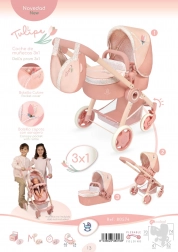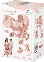 Elegantní dětský kočárek pro panenky v kolekci Tulipe přináší 3 v 1 využití – hluboká korbička, sportovní verze i přenosná taška. Díky otočným předním kolečkům, nastavitelné rukojeti 70 cm a skládací konstrukci je kočárek snadno ovladatelný a praktický na cestování. Stylový design v teplých pastelových tónech s květinovým vzorem doplňuje odnímatelná taška ve tvaru tulipánu a promyšlené detaily pro pohodlnou hru.