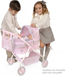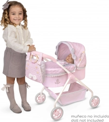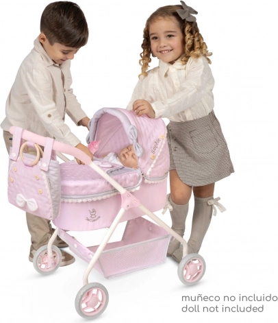Praktická výbava zahrnuje odnímatelnou tašku na kočárek nebo do ruky, kryt korbičky s očky a kapsičkami, pohodlnou matraci a spodní úložný prostor na drobnosti. Španělský design a precizní zpracování zajišťují dlouhou životnost a radost ze hry každý den.