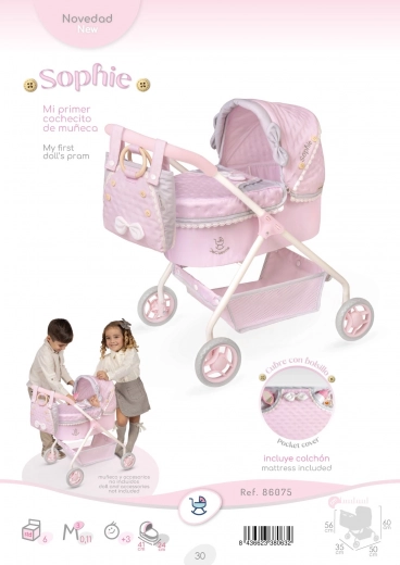 Okouzlující kočárek pro panenky z kolekce Sophie vznikl s důrazem na komfort, bezpečnost a snadnou manipulaci. Světle růžový design doplňují decentní šedé a bílé detaily, které podtrhují romantický styl. Díky nízké rukojeti a lehké konstrukci je vhodný zejména pro nejmenší slečny.