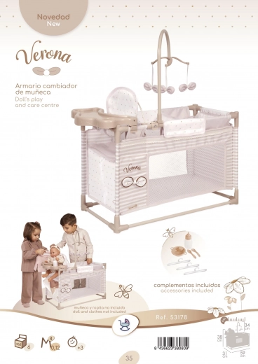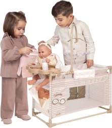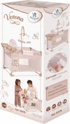Stylová dětská postýlka pro panenky z kolekce VERONA potěší bohatým příslušenstvím a jemným přírodním designem. Nabízí kolotoč s mašličkami, přebalovací pultík, jídelní židličku se setem a praktickou šatnu na zip. Díky preciznímu zpracování a snadné manipulaci je ideální pro děti od 3 let.