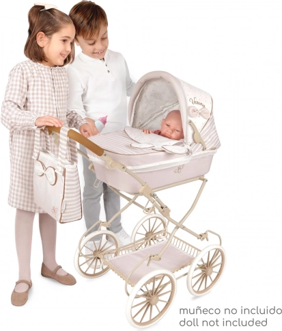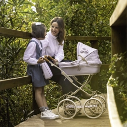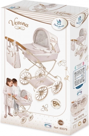 Kolekce Verona zaujme jemnou kombinací světle béžové a bílé s decentními proužky a puntíky, které doplňují elegantní mašličky a drobné výšivky. Kočárek je navržen pro komfortní vození panenek a snadnou manipulaci, zároveň se snadno skládá pro úsporu místa.