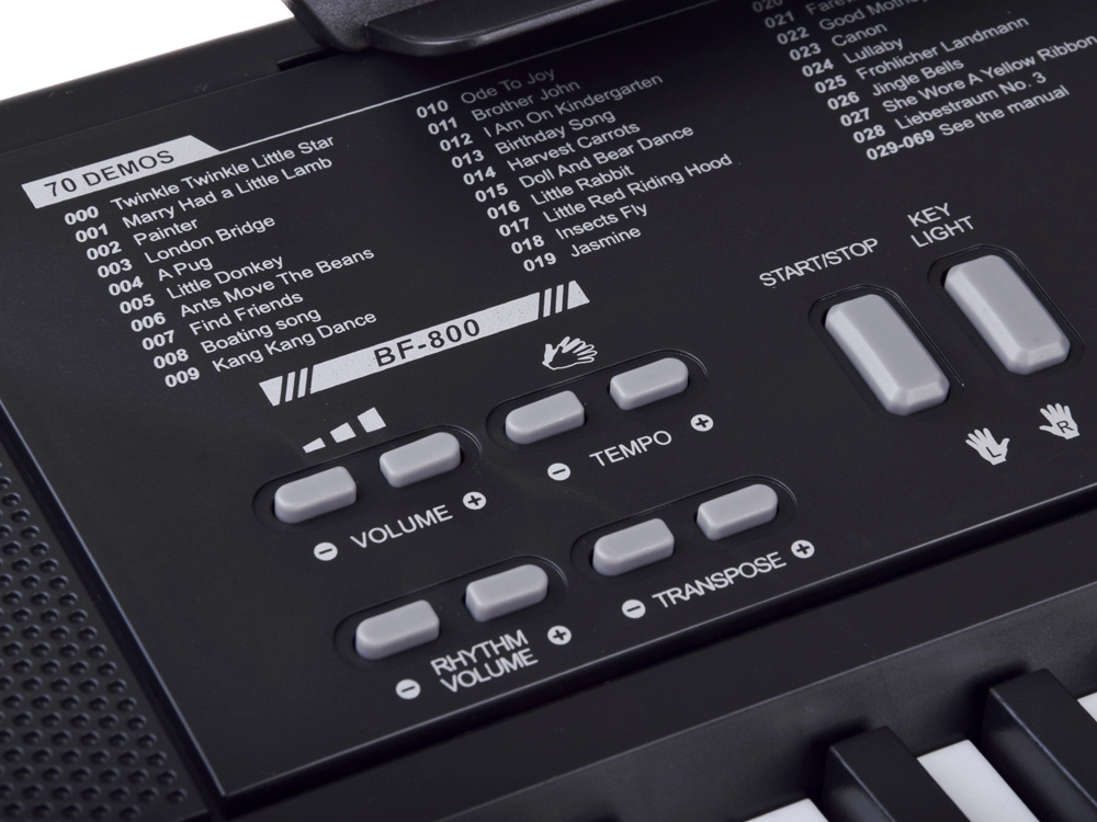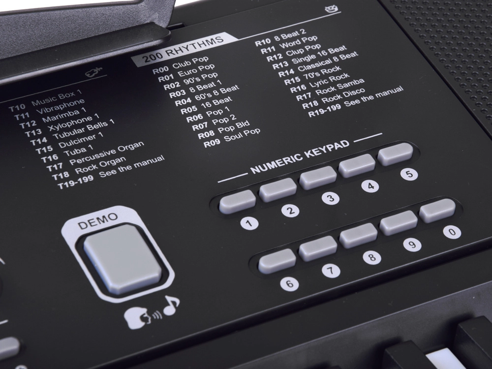 Vybírat můžete z 200 zvuků (piana, varhany, smyčce, dechy i moderní syntezátory) a 200 doprovodných stylů od popu a rocku až po jazz a disco. Nechybí 70 demo skladeb pro inspiraci a učení, funkce Record/Play pro nahrávání vlastních nápadů ani Numeric Pad pro rychlé číselné zadávání.