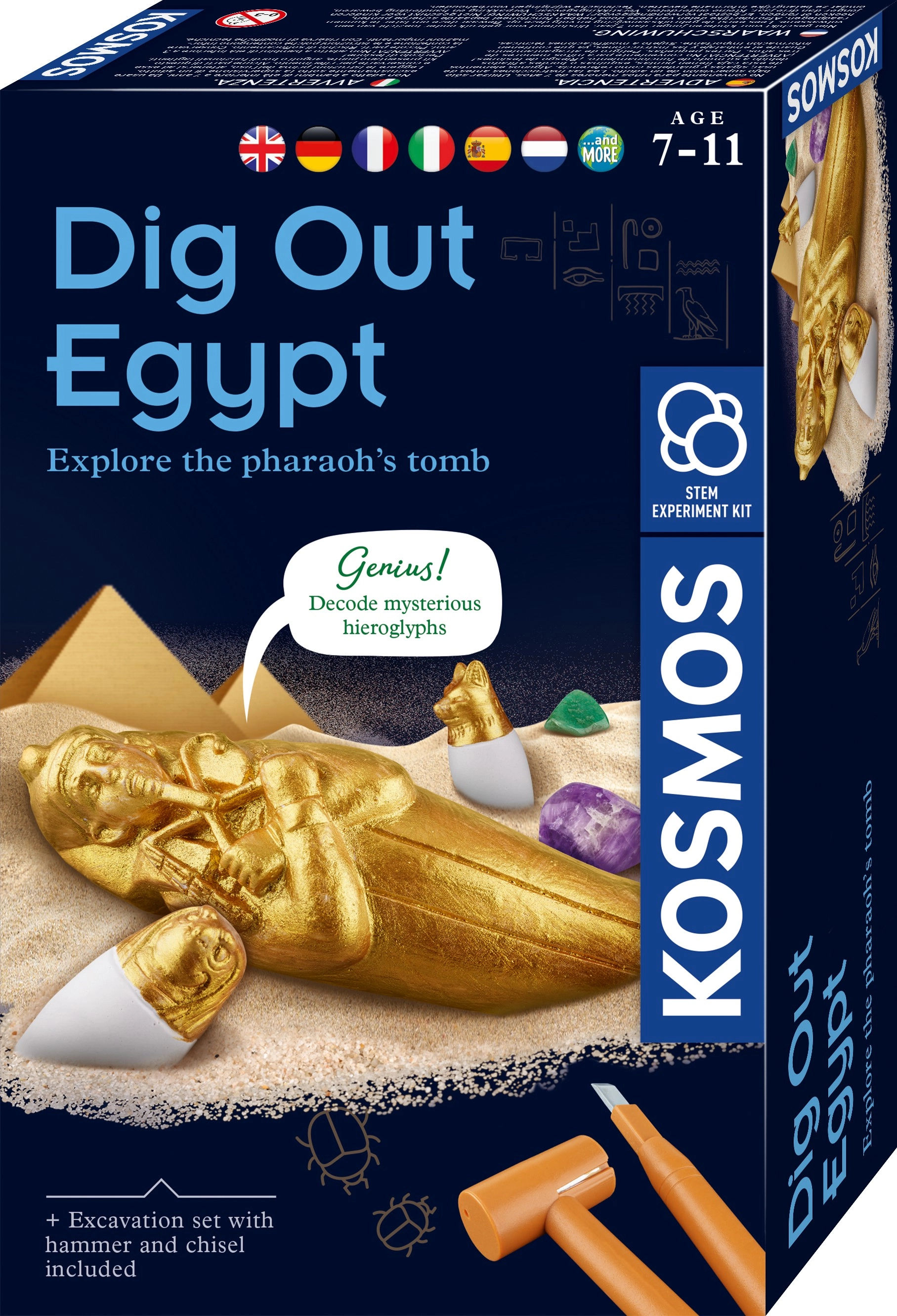 S archeologickou sadou Kosmos egyptské vykopávky se vaše děti stanou malými archeology. Pomocí majzlíku a kladívka budou krok za krokem odkrývat poklady ukryté v sádře a přitom se naučí spoustu zajímavostí o starověkém Egyptě. Praktický návod s obrázky je k dispozici v angličtině i s českým překladem, navíc český návod snadno stáhnete přes QR kód.