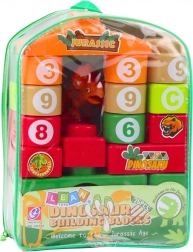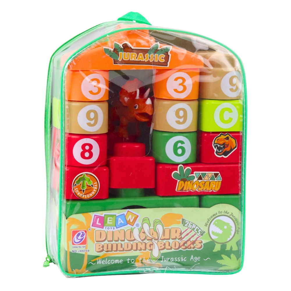 Barevná sada stavebních kostek s motivem dinosaurů přináší zábavné učení písmen a čísel pro nejmenší. Velké, lehké díly se snadno spojují, mají zaoblené hrany a jsou z bezpečných materiálů. Součástí je i figurka dinosaura a praktický batůžek na přenášení, díky kterému mohou děti vzít své oblíbené kostky kamkoli.