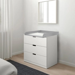 Praktický dřevěný přebalovací nástavec v elegantní šedé barvě pro bezpečné a pohodlné přebalování. Nabízí snadnou montáž i rozložení, posuvnou přední desku až o 4 cm a kompatibilitu s komodami IKEA (Nordli, Malm, Hemnes). Ideální řešení pro úsporu místa a promyšlenou organizaci v dětském pokoji.