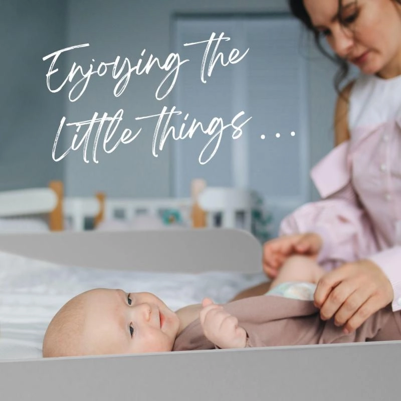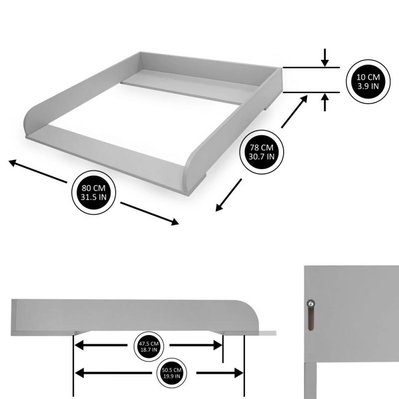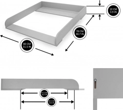 Tento šedý dřevěný přebalovací pult promění vaši komodu v bezpečné a ergonomické místo pro každodenní péči o miminko. Díky posuvné přední desce si pult snadno přizpůsobíte – posun až o 4 cm zajistí lepší dosah a komfort při přebalování.