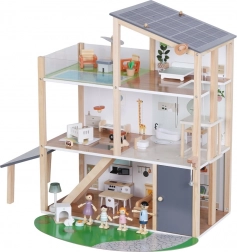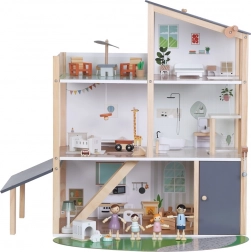 Objevte prostorný dřevěný domeček pro panenky, který potěší každé dítě od 3 let. Nabízí několik pater, plně vybavené místnosti, funkční ruční výtah, střešní terasu a roztomilého králíčka s domečkem. Součástí je čtyřčlenná rodina a bohaté příslušenství pro nekonečnou hru na role a rozvoj fantazie.