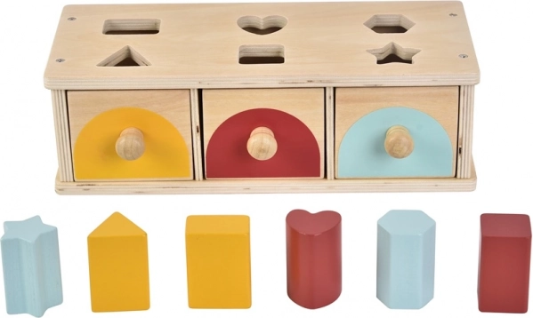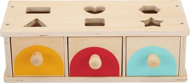 Horní deska s výřezy vede dítě k přesnému vkládání, zatímco tři šuplíky s úchyty umožňují snadné vyjmutí dílků a opakovanou hru. Odolné provedení zajišťuje dlouhou životnost a bezpečné hraní již od 1 roku.