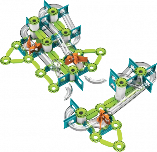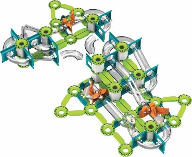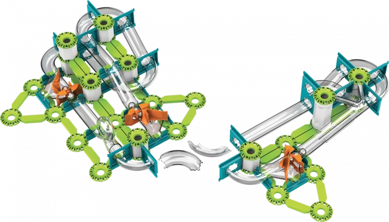 Zelené dráhy, nosníky a oranžové spouštěče snadno propojíte do stabilních tras. Interaktivní prvky vedou kuličky přes zatáčky a pády.