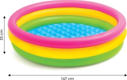 Nafukovací dětský bazén s průměrem 147 cm a výškou 33 cm je ideální volbou pro horké letní dny. Intenzivní barvy růžové, žluté a zelené zaujmou každé dítě a přemění jakýkoliv prostor v malé vodní království.