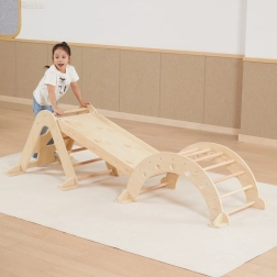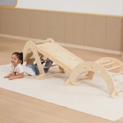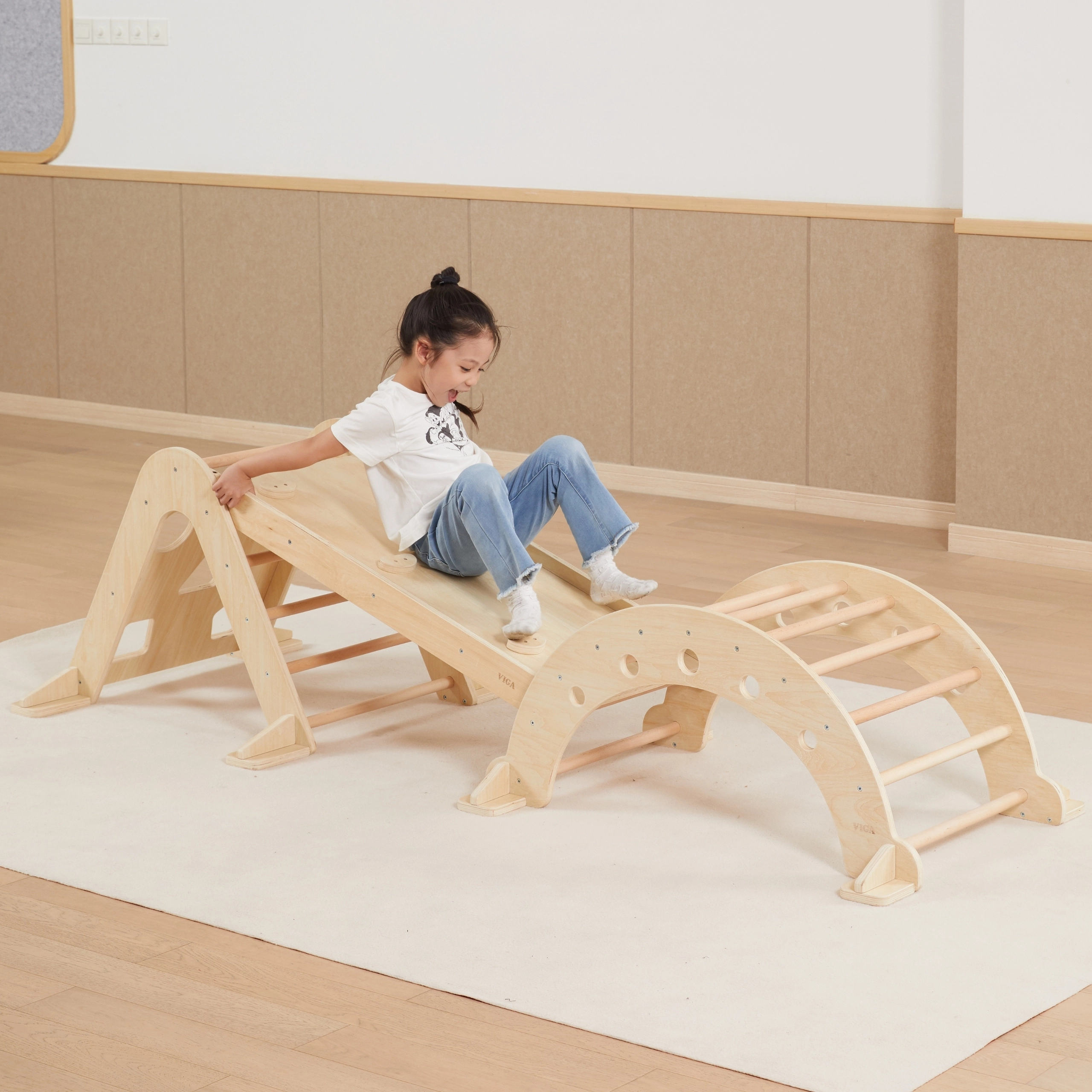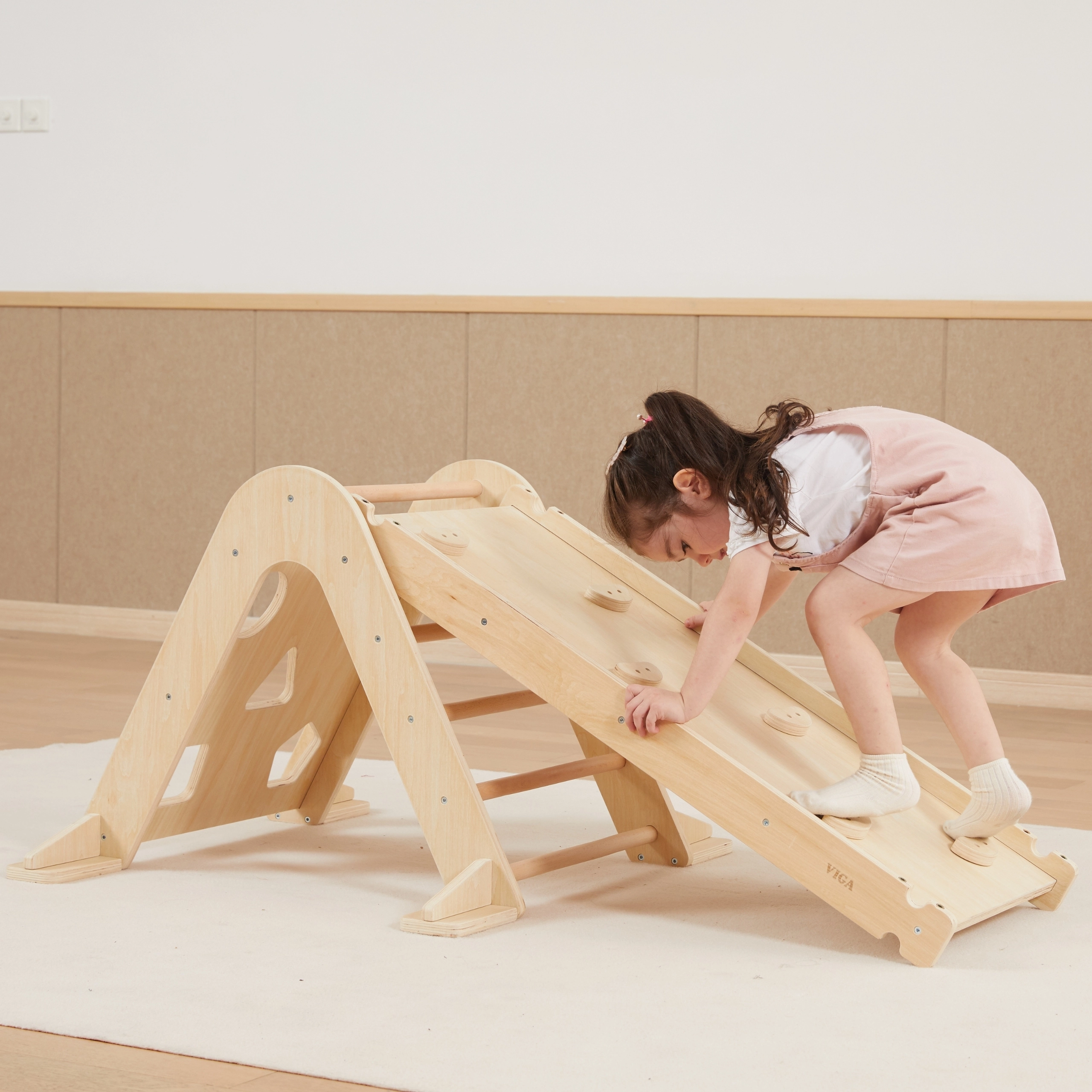 Univerzální dřevěná rampa a lezecká stěna od značky VIGA promění dětský pokoj v bezpečný domácí mini hřiště. Jedna strana slouží jako hladká skluzavka či lávka, druhá jako lezecká stěna s úchyty. Kompatibilní s houpačkou/rockerem a trojúhelníkem, podporuje hrubou motoriku, rovnováhu a koordinaci.