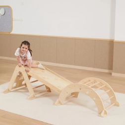 Deska je kompatibilní s doplňky (houpačka/rocker a lezecký trojúhelník), díky čemuž lze vytvořit modulární set pro domácí cvičení a aktivní hru. Vhodné od 18 měsíců, rozvíjí samostatnost, jistotu v pohybu a radost z přirozené aktivity inspirované Montessori principy.
